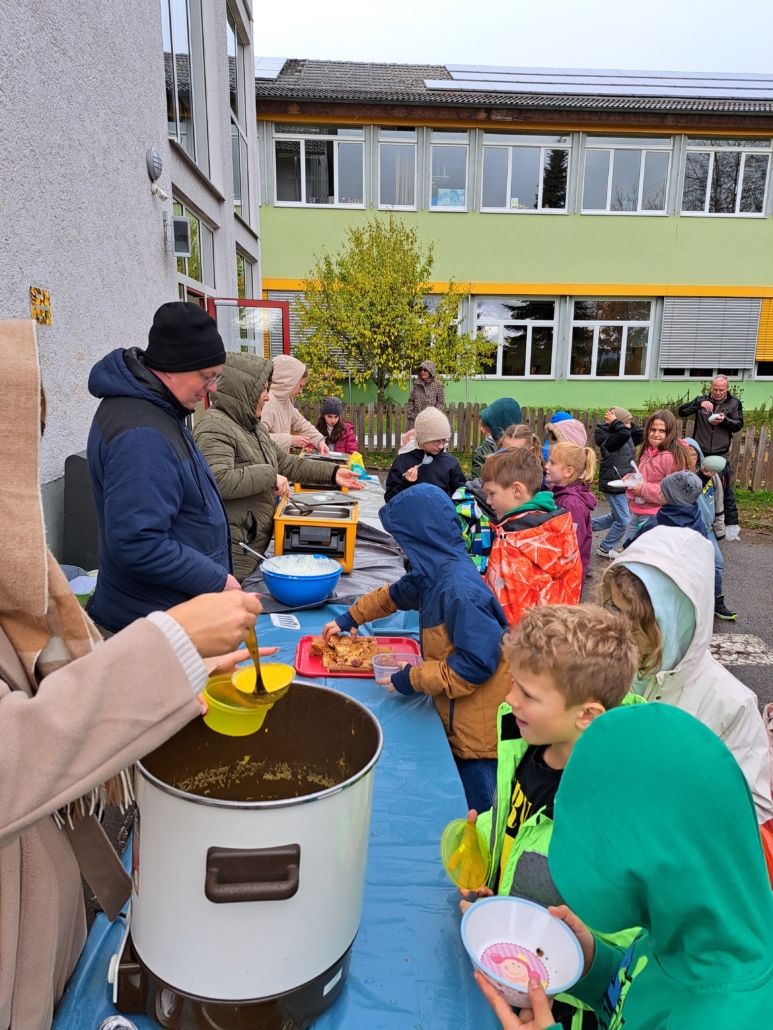 Die Schüler schnippelten, kochten und rührten mit großer Begeisterung. Es gab knusprige Wedges mit Quark, Bratkartoffeln, Kürbissuppe und – passend zur Saison – leckeren Zwetschgenkuchen. In der 5. Stunde versammelten sich alle auf dem Pausenhof, wo viele Eltern, Großeltern und Freunde ebenfalls erschienen, um gemeinsam zu feiern. Der Hof war lebhaft gefüllt, die Töpfe leerten sich rasch, und niemand musste hungrig nach Hause gehen. Neben den köstlichen Speisen bot die Garten-AG auch selbstgemachte Produkte aus dem Schulgarten zum Verkauf an: Marmelade, Sirup, Ringelblumensalbe und Tee. Der Erlös fließt in neue Gartengeräte.